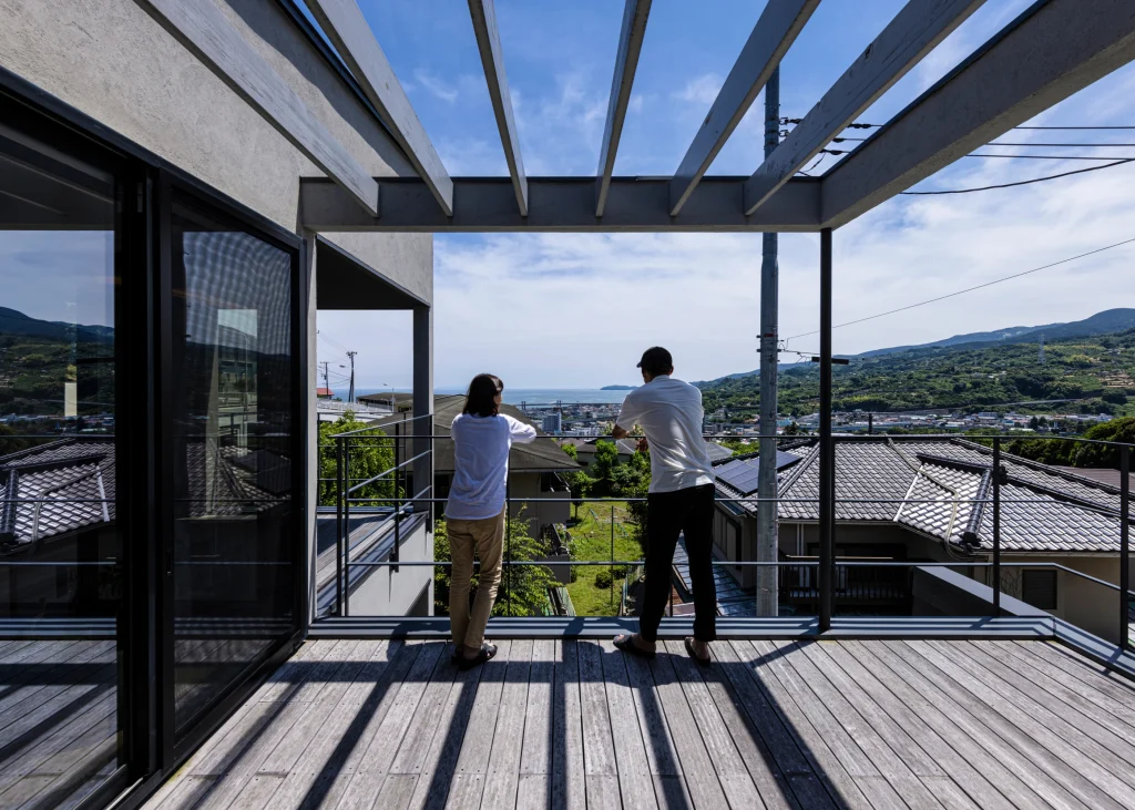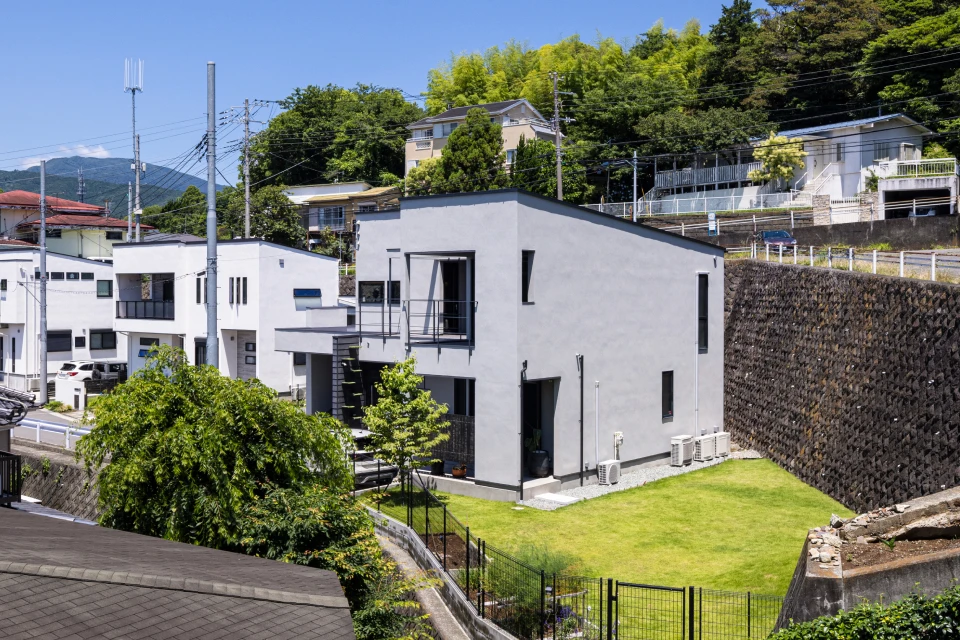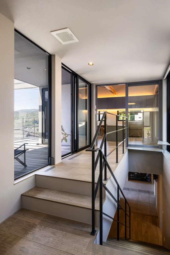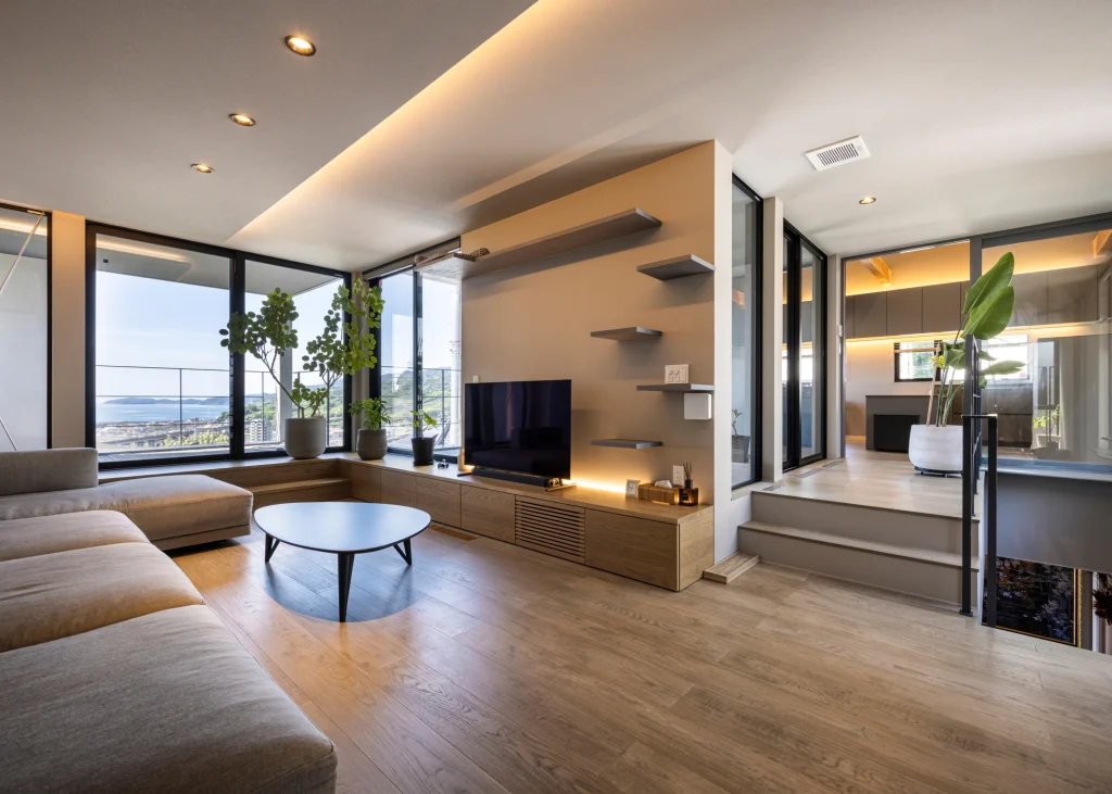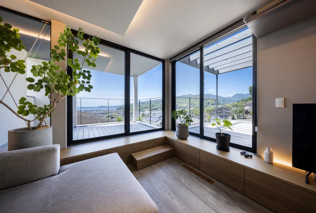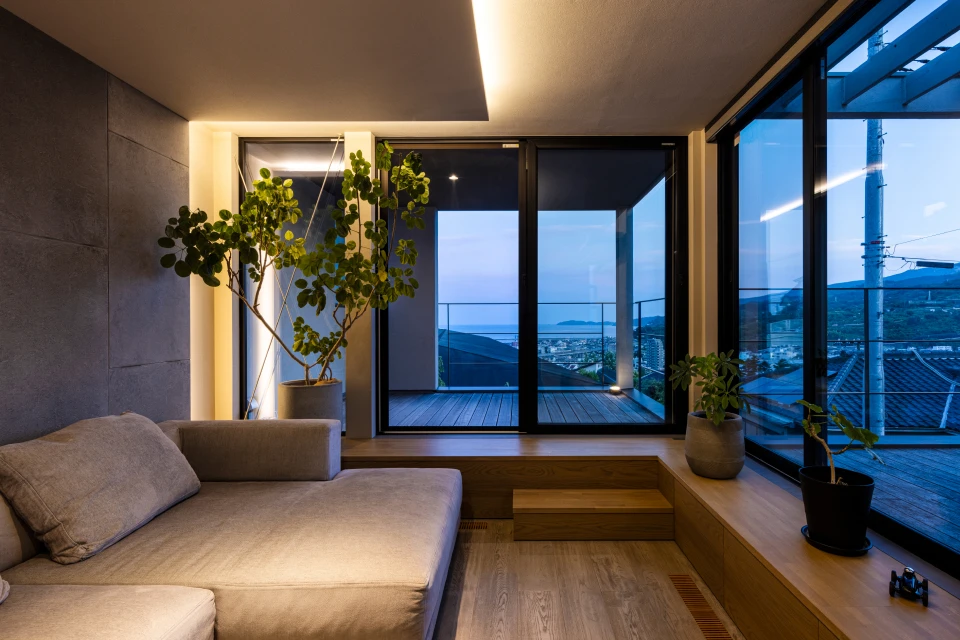 The living room offers a panoramic view stretching from the Pacific Ocean to the Hakone mountains. Through thoughtful building placement and floor height adjustments, the surrounding houses are excluded from view, allowing the scenery to shine.