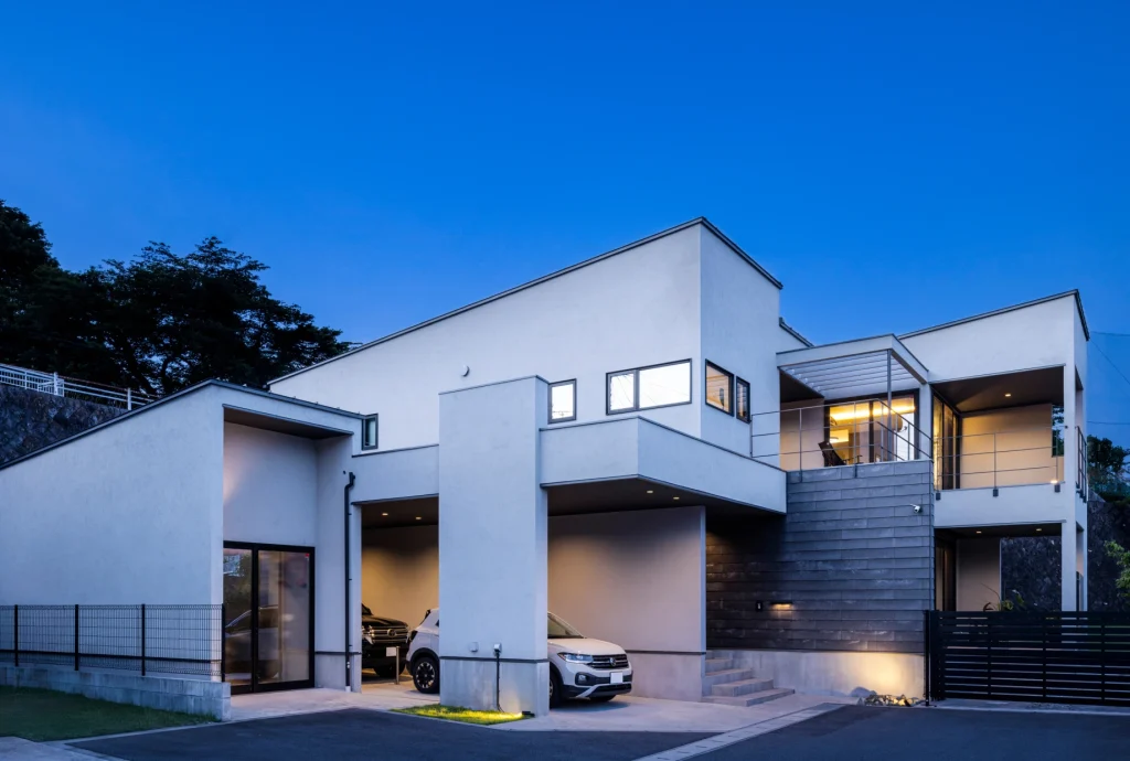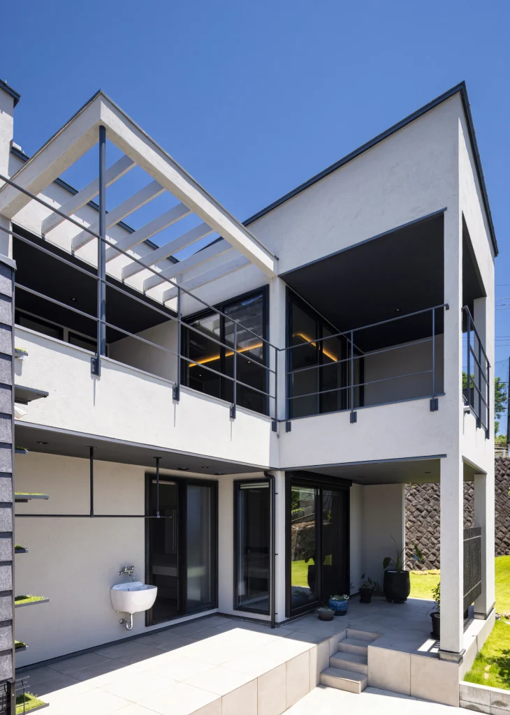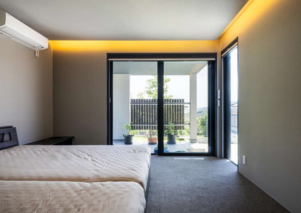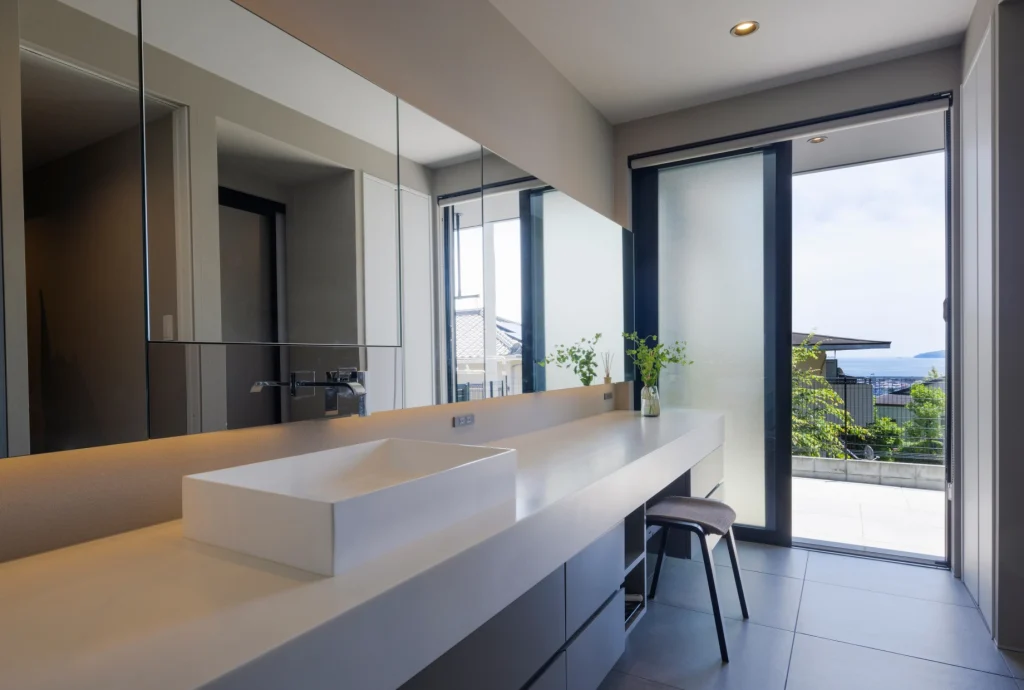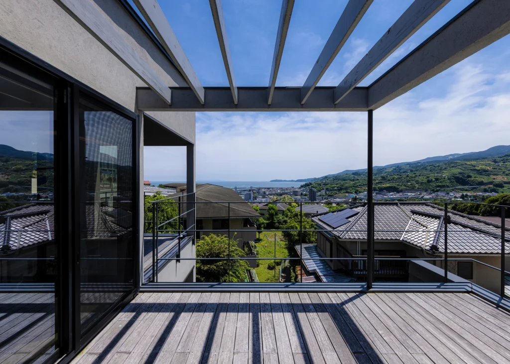 The living room offers a panoramic view stretching from the Pacific Ocean to the Hakone mountains. Through thoughtful building placement and floor height adjustments, the surrounding houses are excluded from view, allowing the scenery to shine.