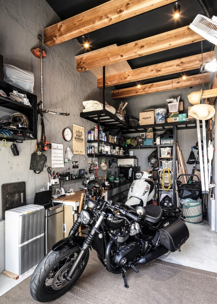 The hobby garage is designed for full customization by the client. It is separated from the main house and features high ceilings to minimize noise interference.