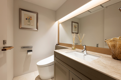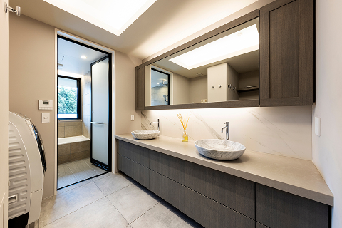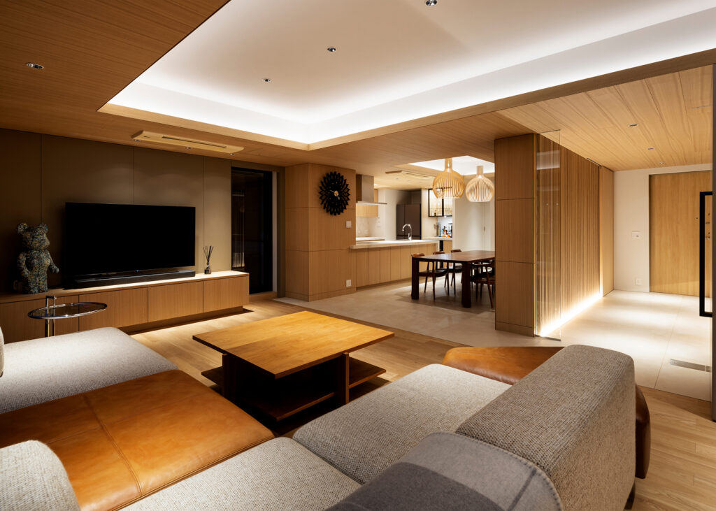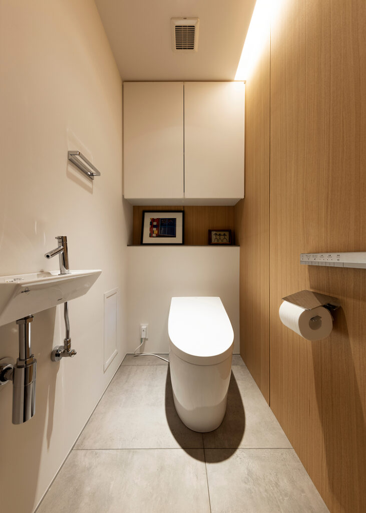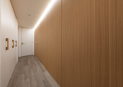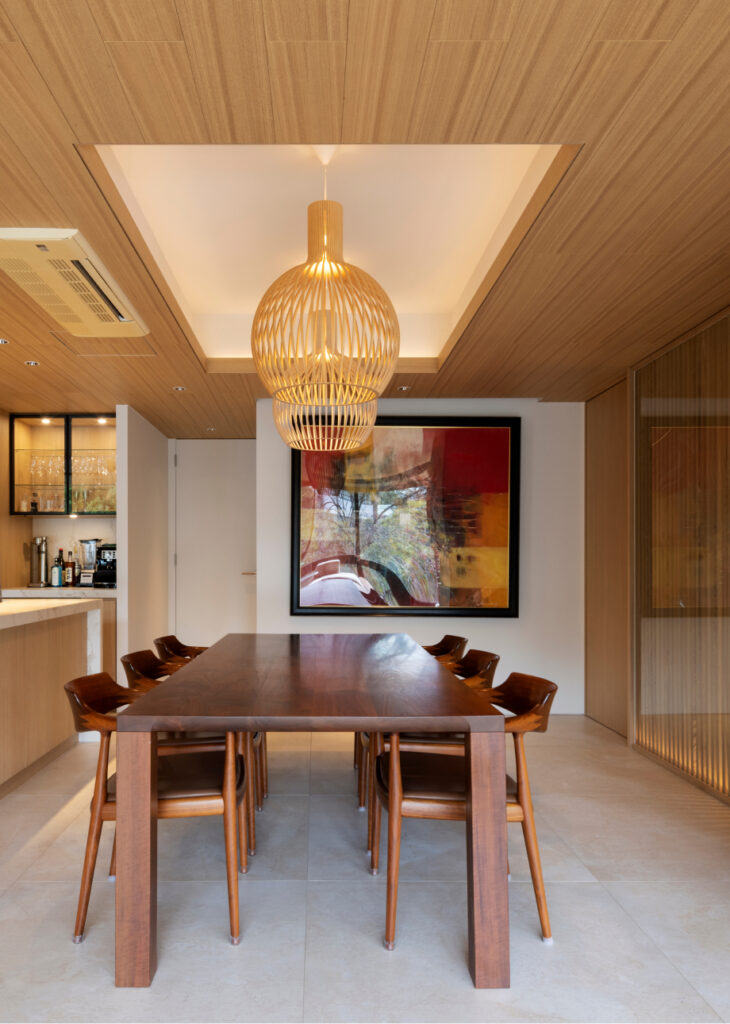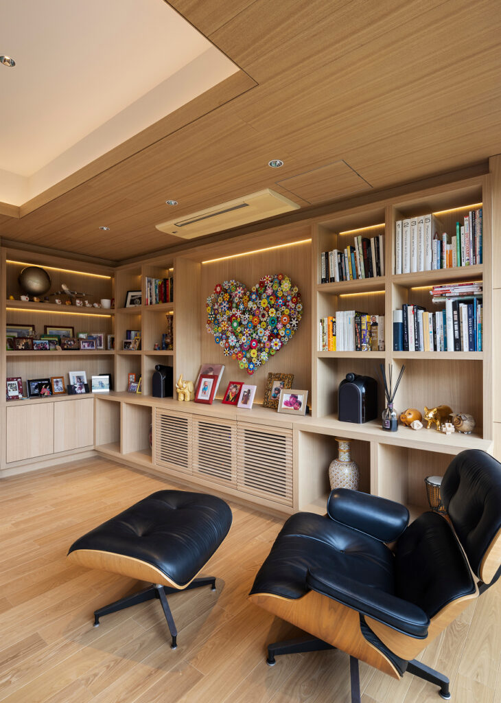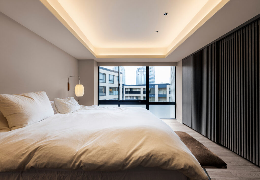 The bedroom is designed in a refined Japandi style, using a gray palette and meticulous detailing to create a new expression of calm and elegance.