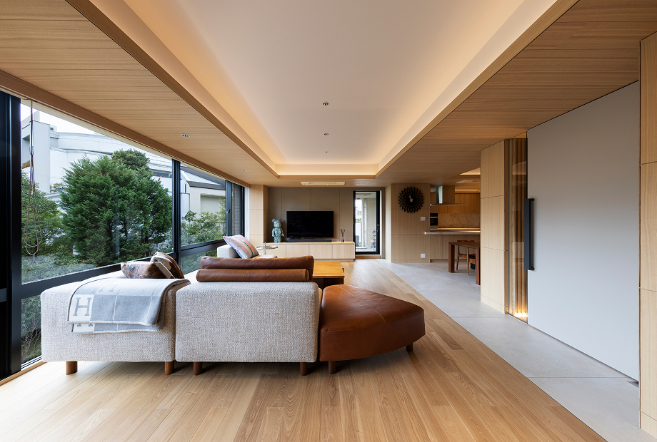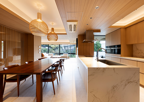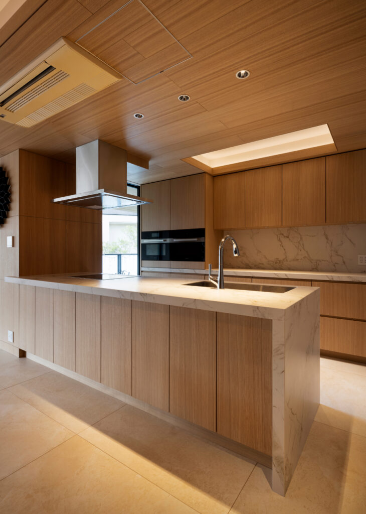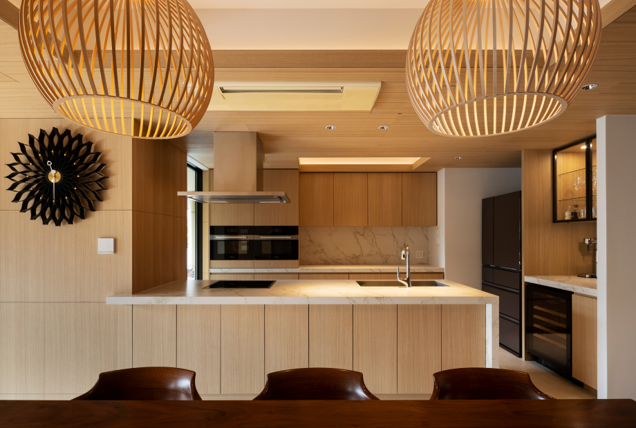 The kitchen is reimagined as a natural extension of the living space—bright and open to the room, yet designed so that daily work remains visually unobtrusive.